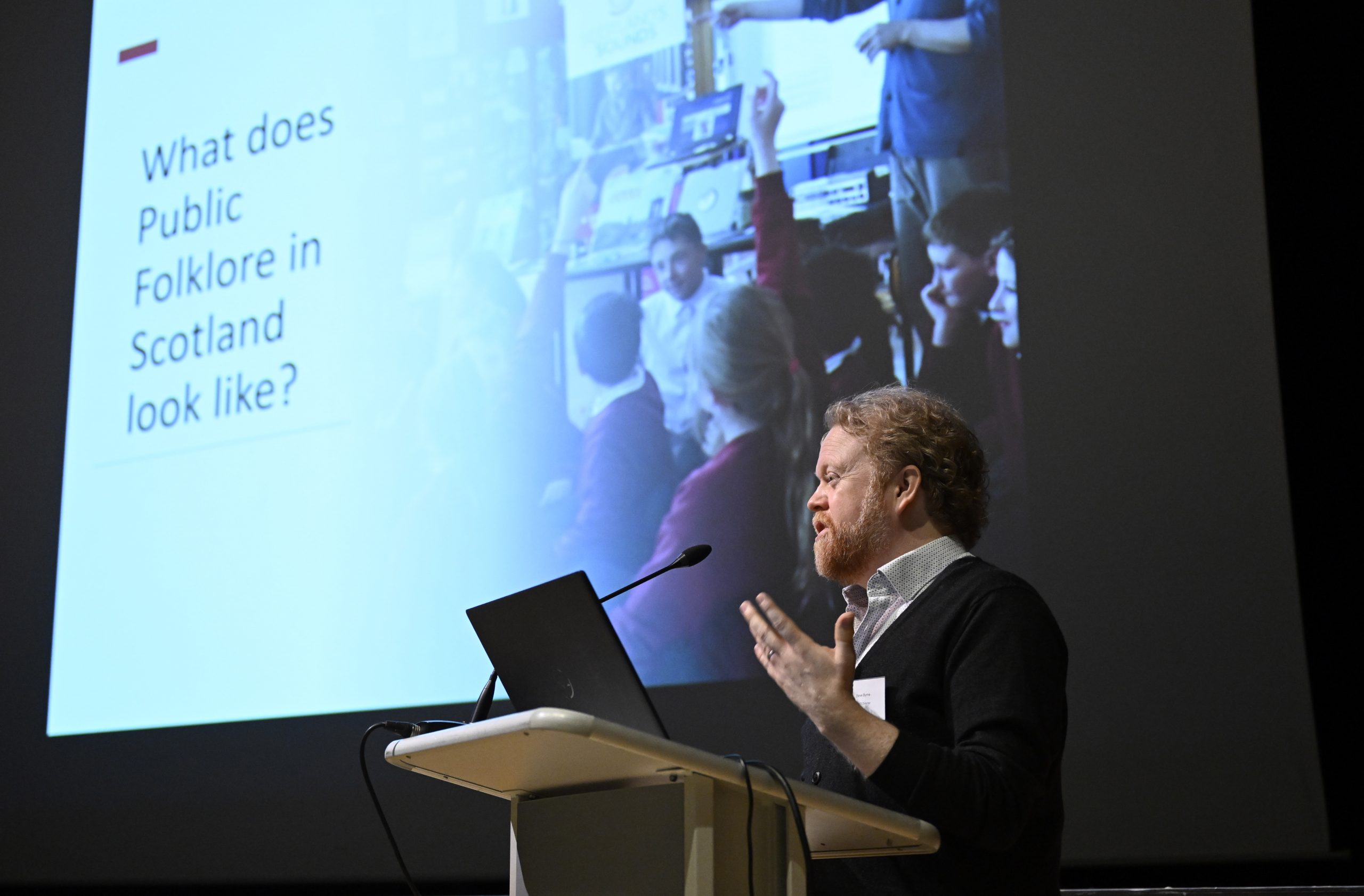 Steve Byrne, Director of TRACS speaking at the Intangible Cultural Heritage Conference in Birnam Arts in 2023. Photo Neil Hanna